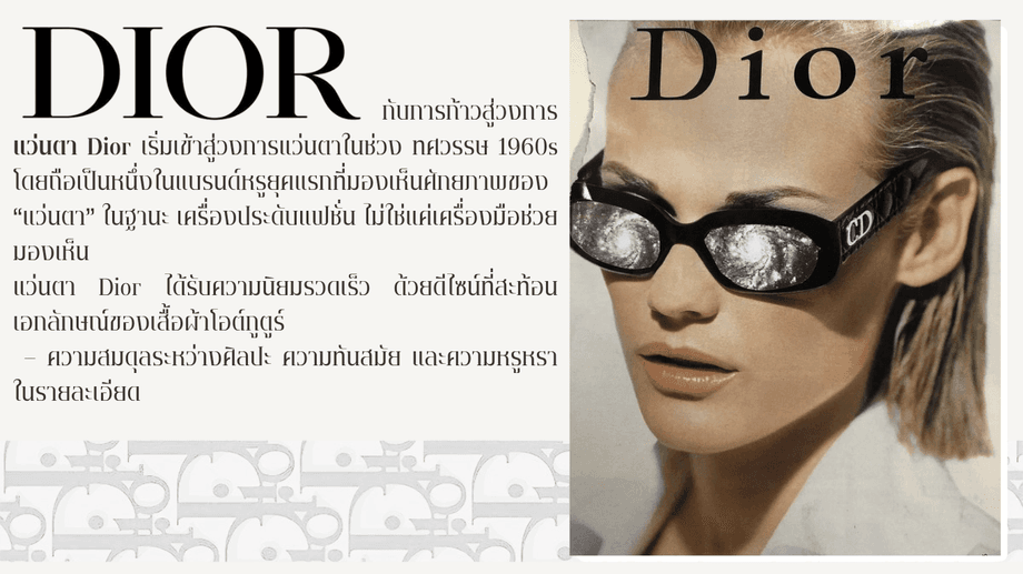 โลโก้ “CD” หรือสัญลักษณ์ “Dior Oblique” ที่มักสลักไว้บริเวณขาแว่นหรือข้อต่อ สื่อถึงความประณีตและสถานะของผู้สวมใส่